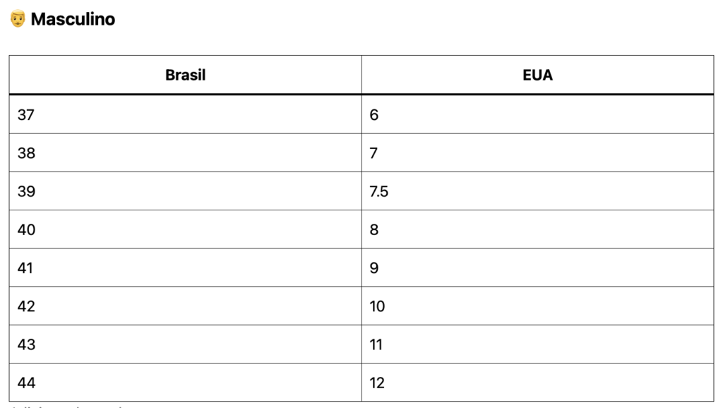 Por que a conversão de tamanho calçados Brasil EUA pode variar?
